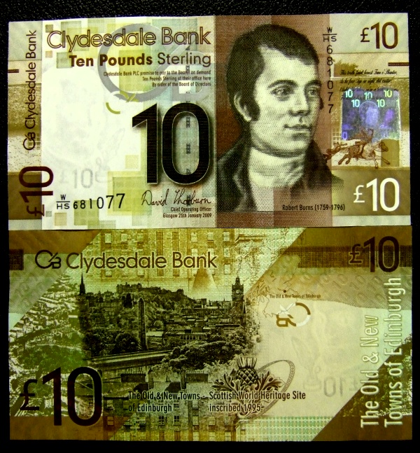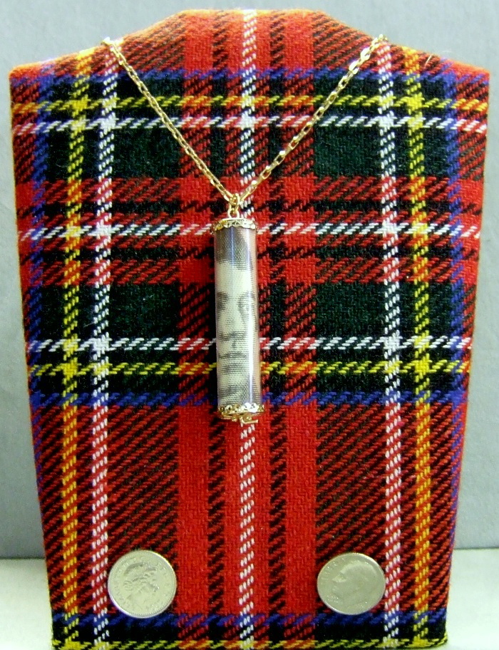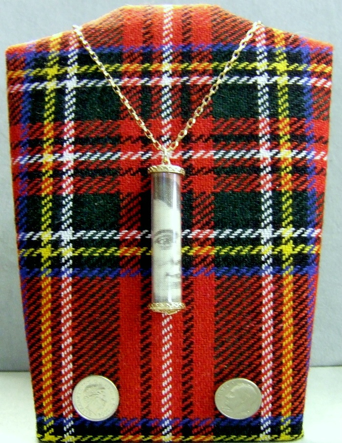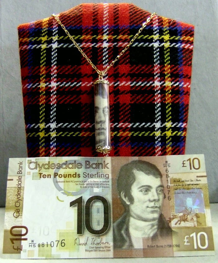 gold pendant that hold a real Scottish ten pound note bearing his portrait