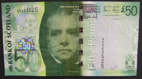New Scottish £50 note with Sir Walter Scott on front and the Falkirk Wheel on back