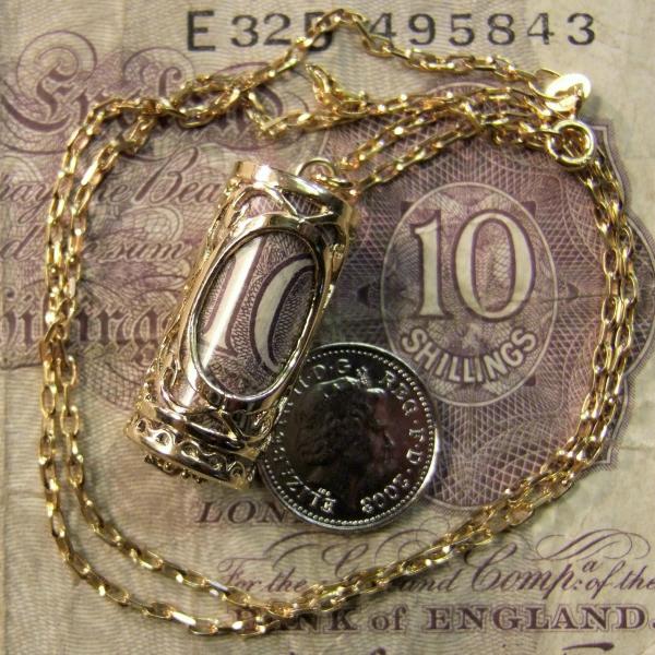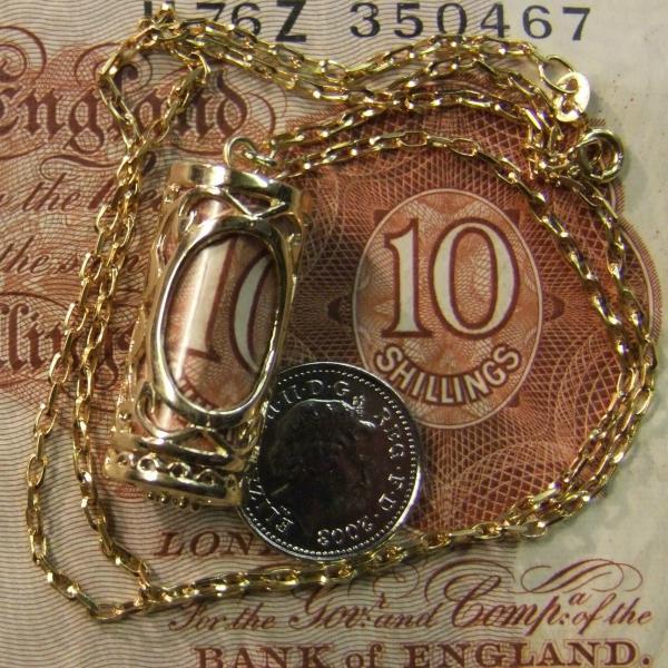 PAIR OF WAR £1 & 10/- NOTES IN DIAMOND CUT PENDANT & CHAIN